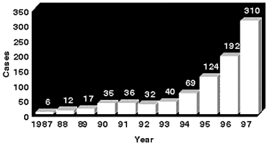Facilitating STD treatmentAt the time the project began AIDS patients were not visible in the communities and sex workers did not see the importance of STD treatment and safer sex practices. Over the 18 months of the project's life (March 1996-September 1997), this has all changed rapidly. Several workers have buried their sisters and other relatives with confirmed cases of AIDS, and many have seen people in their communities die of what they believe must be AIDS. AIDS has finally become an issue discussed in public by senior politicians and the reported confirmed cases of HIV have risen rapidly. Table 1 shows the national official statistics on HIV.
